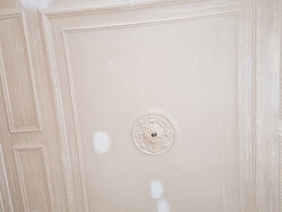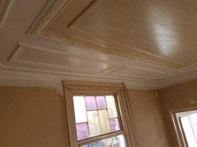 Een monumentaal plafond wat al 70 jaar niet meer geschilderd was voorzien van een nieuwe verflaag is geen eenvoudige klus. Na reparaties en drie lagen verf ziet het plafond er weer uit als nieuw, zonder dat de authentieke details verloren zijn gegaan.